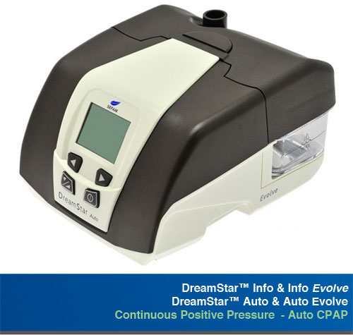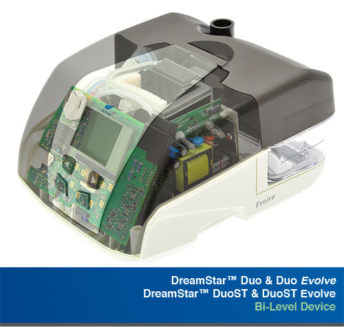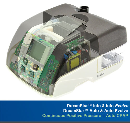 DreamStar™ Range has a configuration without humidifier and the Evolve configuration with an integrated heated humidifier. The Evolve Configuration may be used either with a water reservoir for humidification or without humidification by replacing the reservoir with a cover.